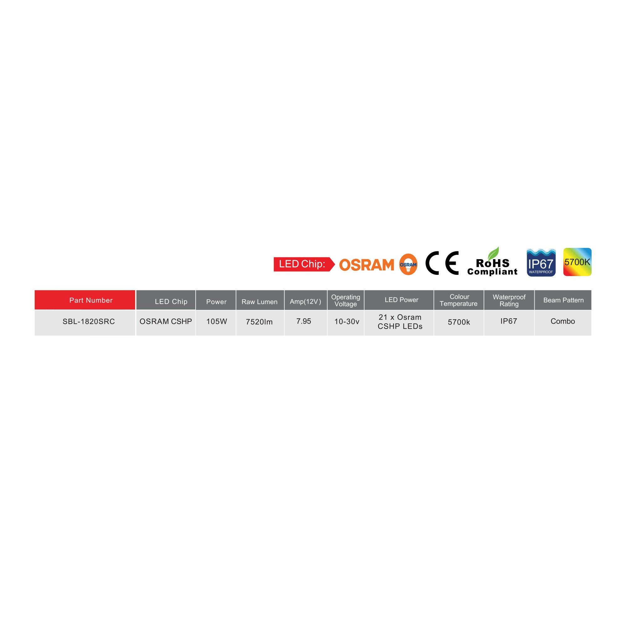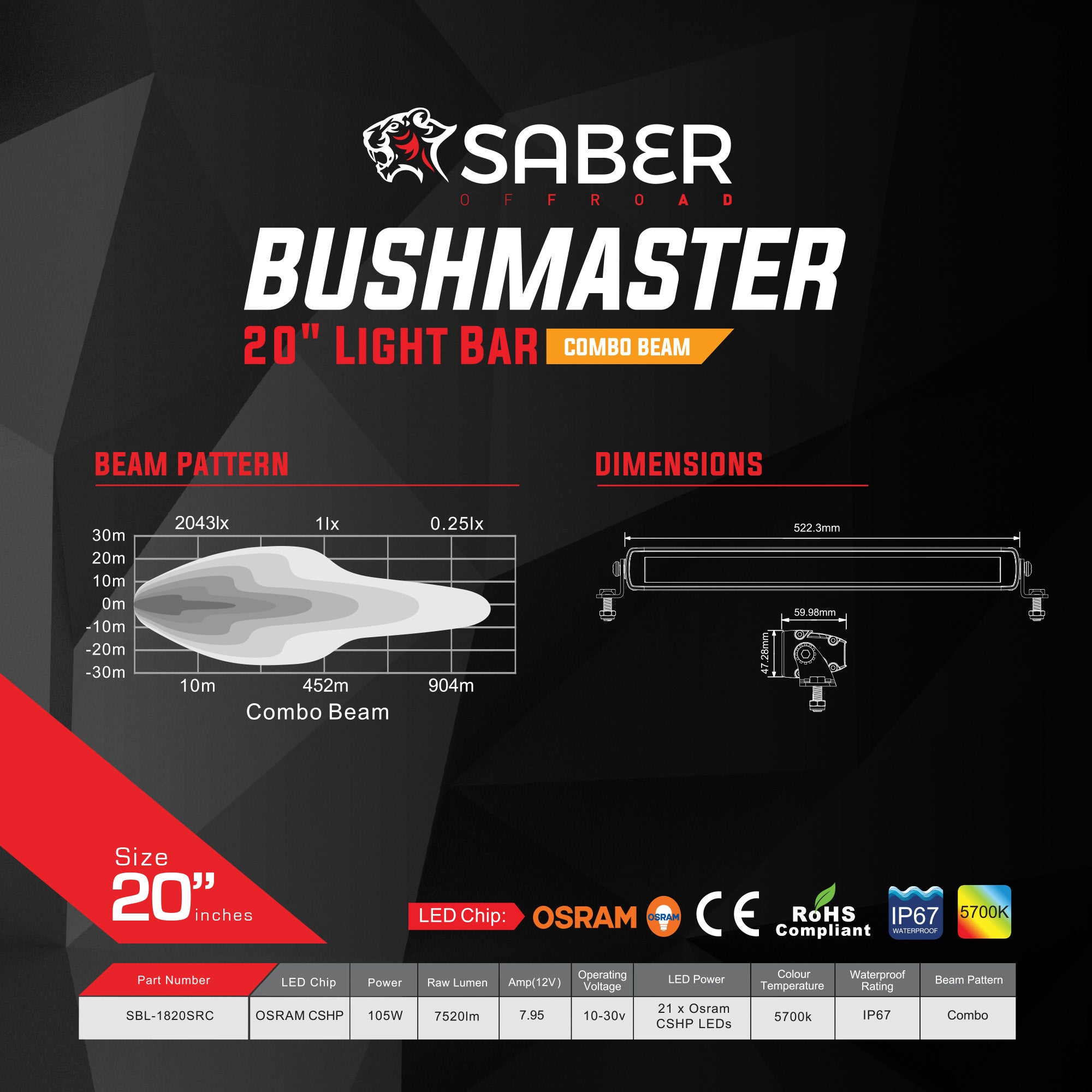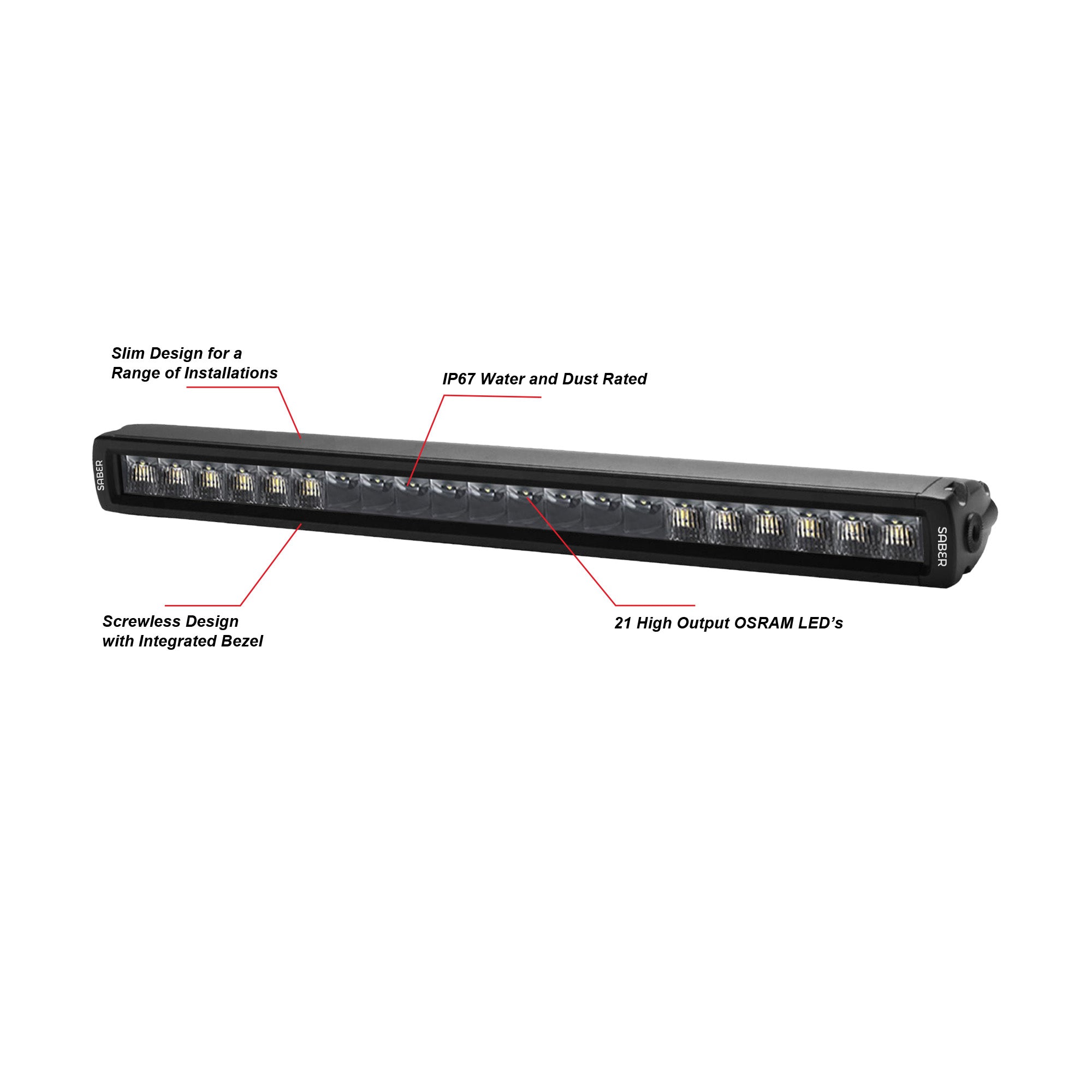 This 20” Single Row Light bar will give you optimum light performance without the challenges of excess current draw. The high intensity Osram CSHP LED’s, combined with Saber's lightweight aluminium extruded housing makes this a must for your next adventure.