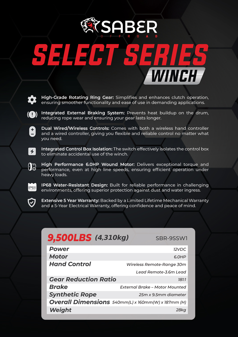 Introducing the Saber Winch - 9,500LB, engineered and manufactured by Saber Offroad to deliver unparalleled performance, reliability, and ease of use in the most demanding environments. This advanced winch system is designed with both professional and enthusiast users in mind, combining cutting-edge technology, innovative features, and exceptional durability to provide the ultimate winching solution for your toughest tasks.