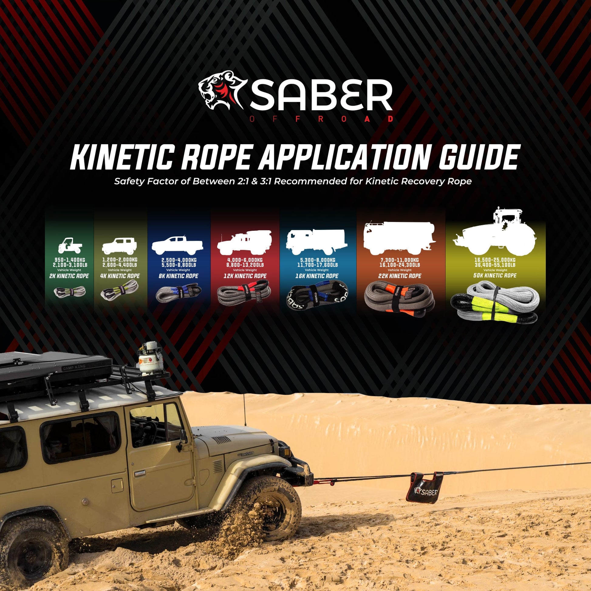 The Saber Offroad 9-Metre 16,000kg Kinetic Recovery Rope is one of the most effective recovery tools you can carry in your vehicle. Compared to tow rope chains or even a traditional snatch strap, the benefits of using a kinetic recovery rope is clear as day.
